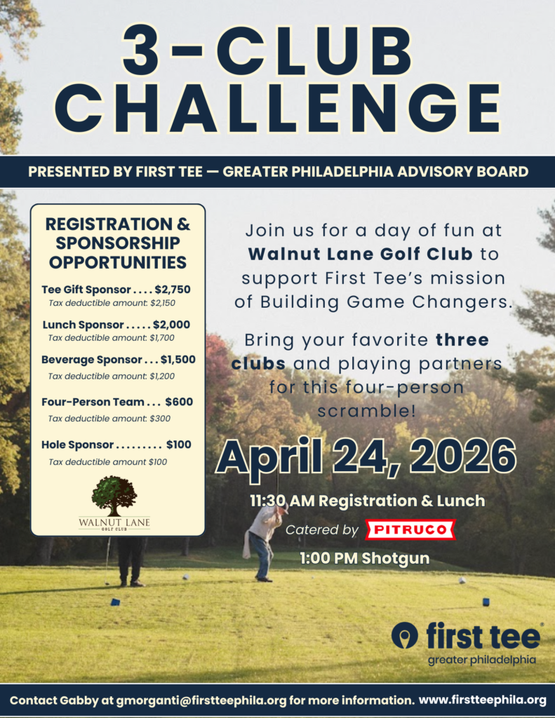 Join us on Friday, April 24th, for a day of fun at Walnut Lane Golf Club to support First Tee’s mission of Building Game Changers.